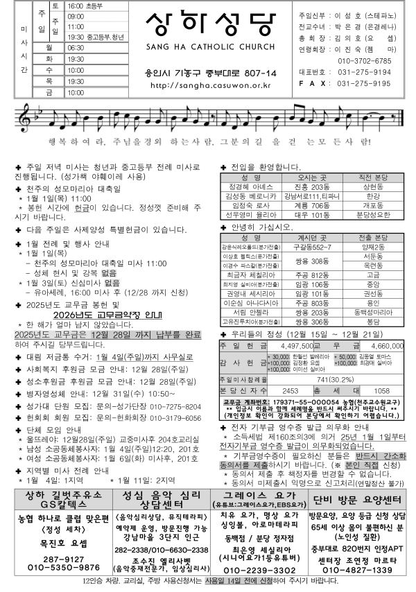 2025년 12월 28일 예수마리아요셉 성가정축일 페이지 정보 작성자 상하성당 댓글 0건 조회 158회 작성일25-12-25 20:34 첨부파일 2025.12.28 예수마리아요셉 성가정축일.pdf (98.7K) 6회 다운로드 | DATE : 2025-12-25 20:34:08 본문 2025년 12월 28일 예수마리아요셉 성가정축일 주보입니다. 댓글목록 목록